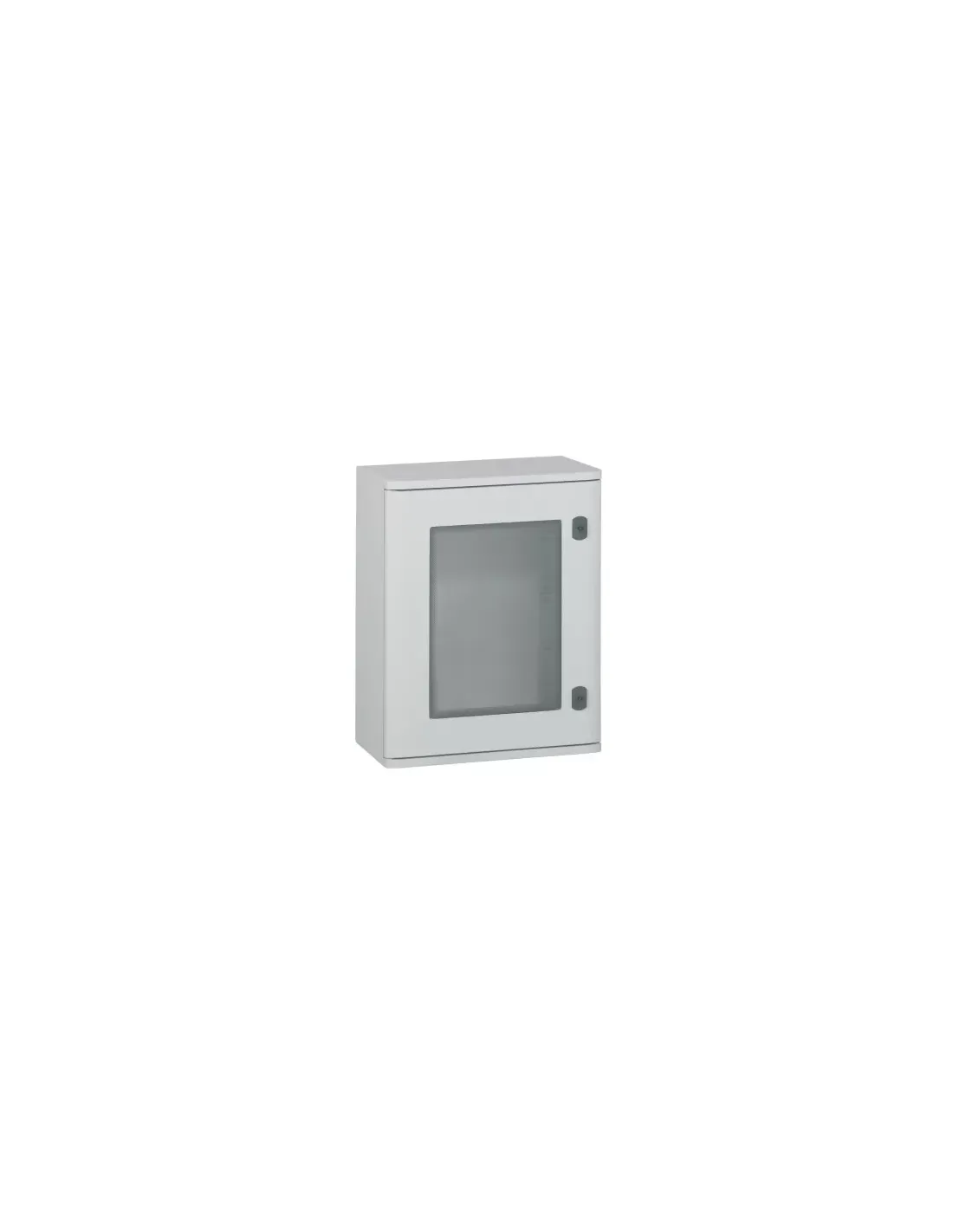 Polyesterrahmen 400 x 300 x 206 mm mit Glastür. IP 66 gemäß IEC EN 60529 und IK 10 gemäß IEC EN 62262 (EN 50102), Klasse II(1). Glasfaserverstärktes Polyester, selbstverlöschend bei 960 °C gemäß IEC EN 60695-2-11. Geeignet für korrosive Umgebungen. Umkehrbare Tür, 180°-Öffnung mit unübersehbaren Scharnieren. Doppelstangenschloss. Direkte Befestigung des Geräts an der Unterseite des Paneels.