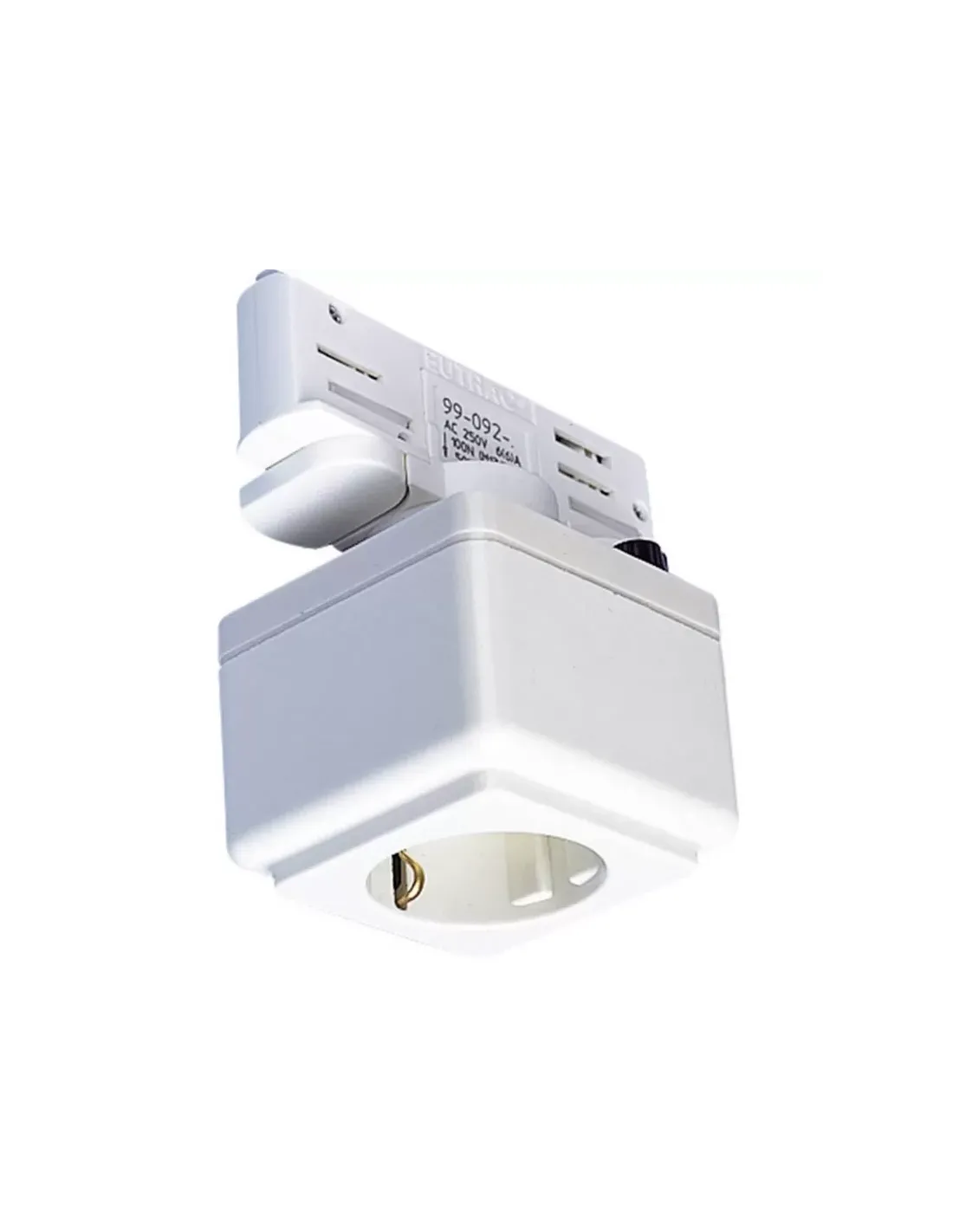 Schienensteckdose für das Hochspannungs-Dreiphasen-Oberflächenmontage-Schienensystem. Die in verschiedenen Farbvarianten erhältliche Steckdose ist für den Anschluss von Geräten der Schutzklasse I (Schuko-System) oder Schutzklasse II geeignet. Die Gleissteckdose bietet neben einer trägen 6,3A-Sicherung auch die Power-Option.