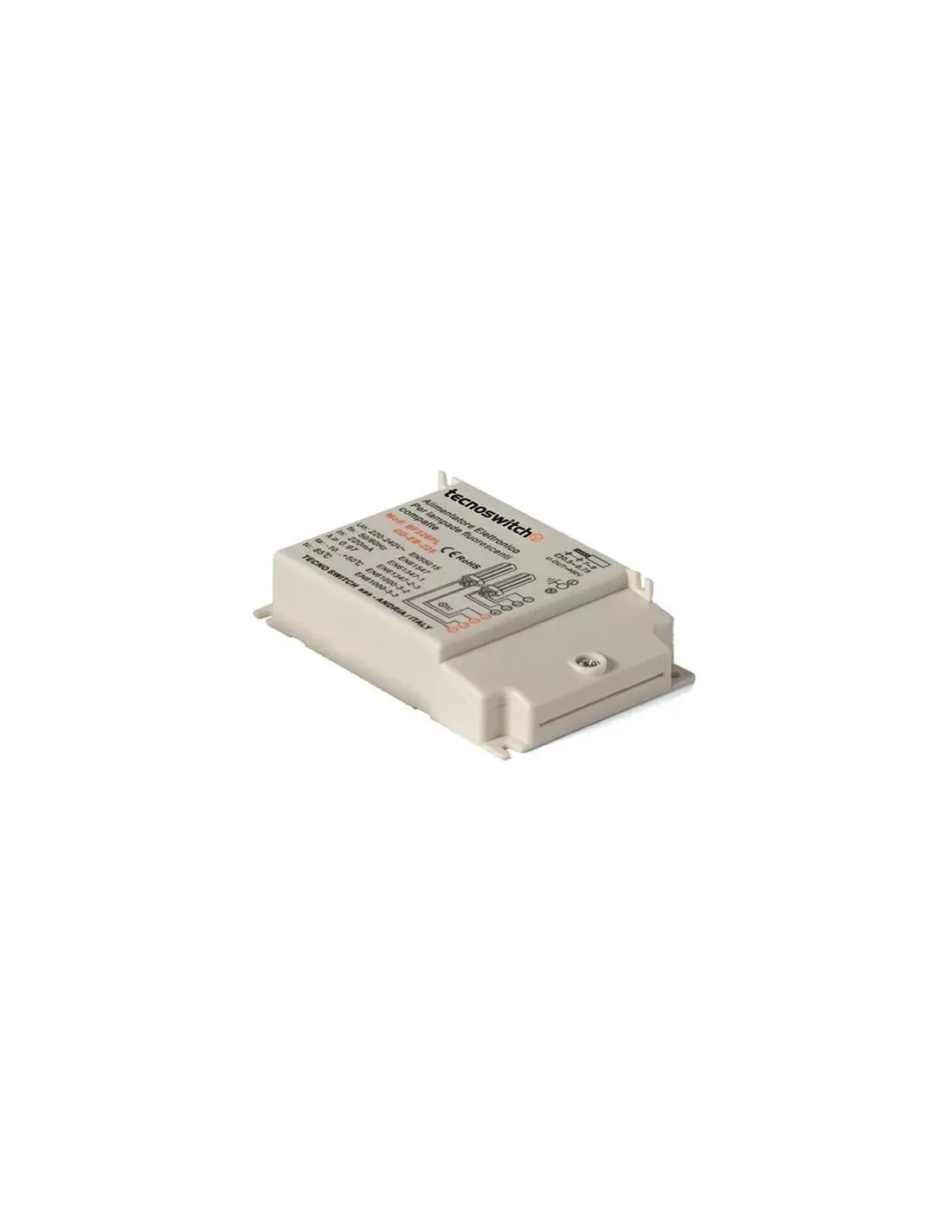 Elektronisches Vorschaltgerät für Kompaktleuchtstofflampen 50–60 Hz – 220/240 VAC. Geeignet für 4-polige PL-Lampen. EEI-Klassifizierung = A2. Kunststoffbehälter. Schnellanschlussklemmen. Kein Flackern des Lichts – kein Brummen. Maximale Länge zwischen Vorschaltgerät und Lampe 2 m