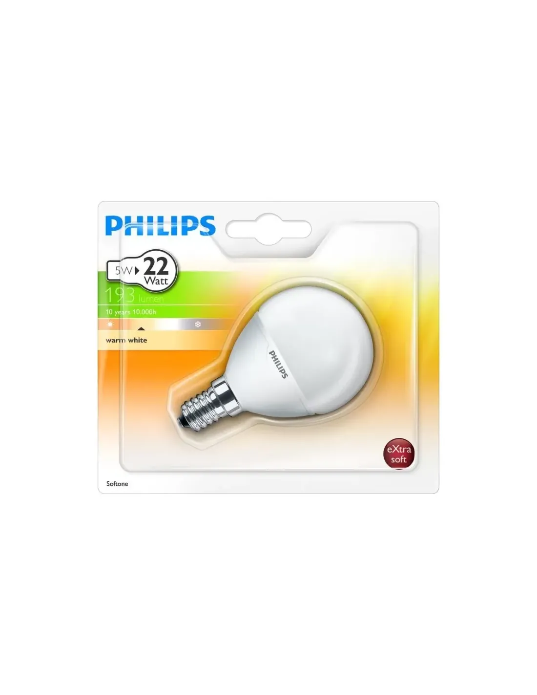 Philips Softone Bombilla esférica de bajo consumo 8727900826814. Potencia de la bombilla: 5 W, Portalámparas: E14, Flujo luminoso: 190 lm, Color de luz: Blanco cálido, Duración de la bombilla: 10000 h