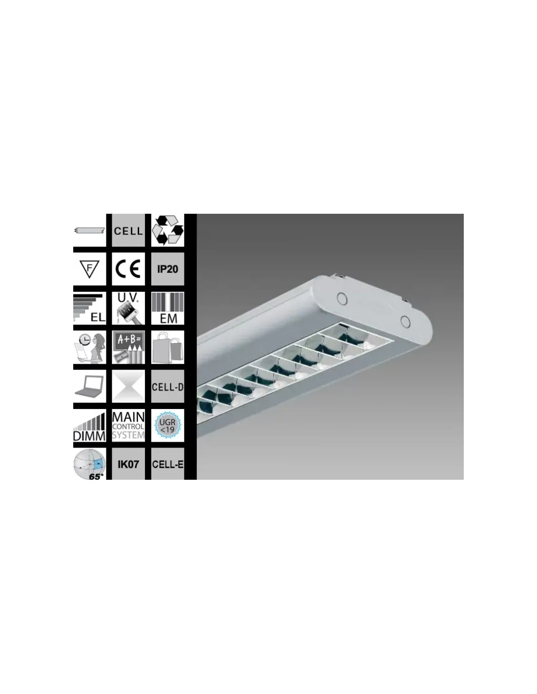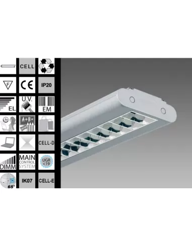 Cuerpo: De aluminio extruido, con cabezales de fundición inyectada Óptica: Luz oscura con doble parabolidad longitudinal y transversal en aluminio especular 99 99, antirreflectante y antiiridiscente a muy baja luminancia Pintura: Polvo con resina a base de poliéster en color plata metalizado o blanco brillante resistente a la corrosión y niebla salina Portalámparas: Contactos de policarbonato y bronce fósforo Cableado: Alimentación 230V//50Hz (CNR), 230-240V//-50//60Hz (CELL) Cable rígido sección 0 50 mm2 y funda de PVC HT resistente a 90° según norma CEI 20-20 Borna 2P T con sección de conductor máxima permitida de 2,5 mm2 Equipamiento: Óptica a presión, permanece fijada con cordón anticaída Cobertura: Posibilidad de luz directa sólo con acc 375 Normativas: Producidos cumpliendo con las normas EN60598 - CEI 34 - 21 Tienen un grado de protección según las normas EN60529 Cumplen con las normas EN12464