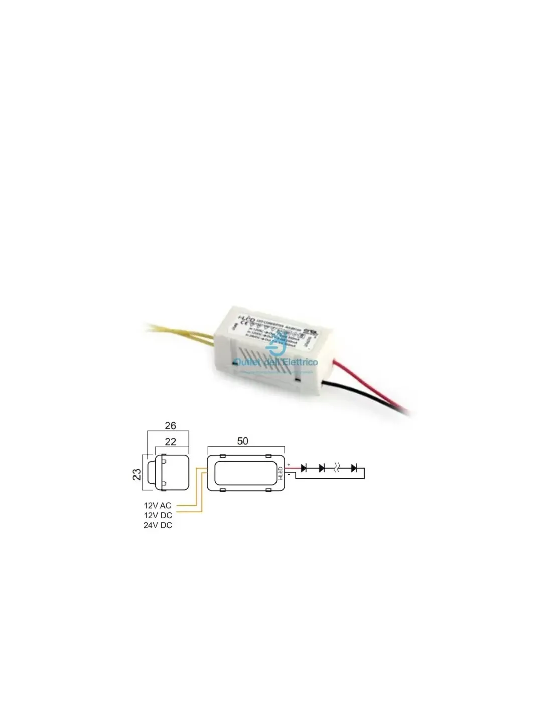 Protection à réarmement automatique contre la surchauffe, la surcharge, le circuit ouvert et le court-circuit au secondaire. Câbles : primaire rouge et blanc 0,35 mm² longueur 170 mm ; secondaire rouge et noir 0,35 mm² longueur 170 mm. Ne pas utiliser avec des transformateurs électroniques. Possibilité de connecter la tension d'entrée aux deux polarités.