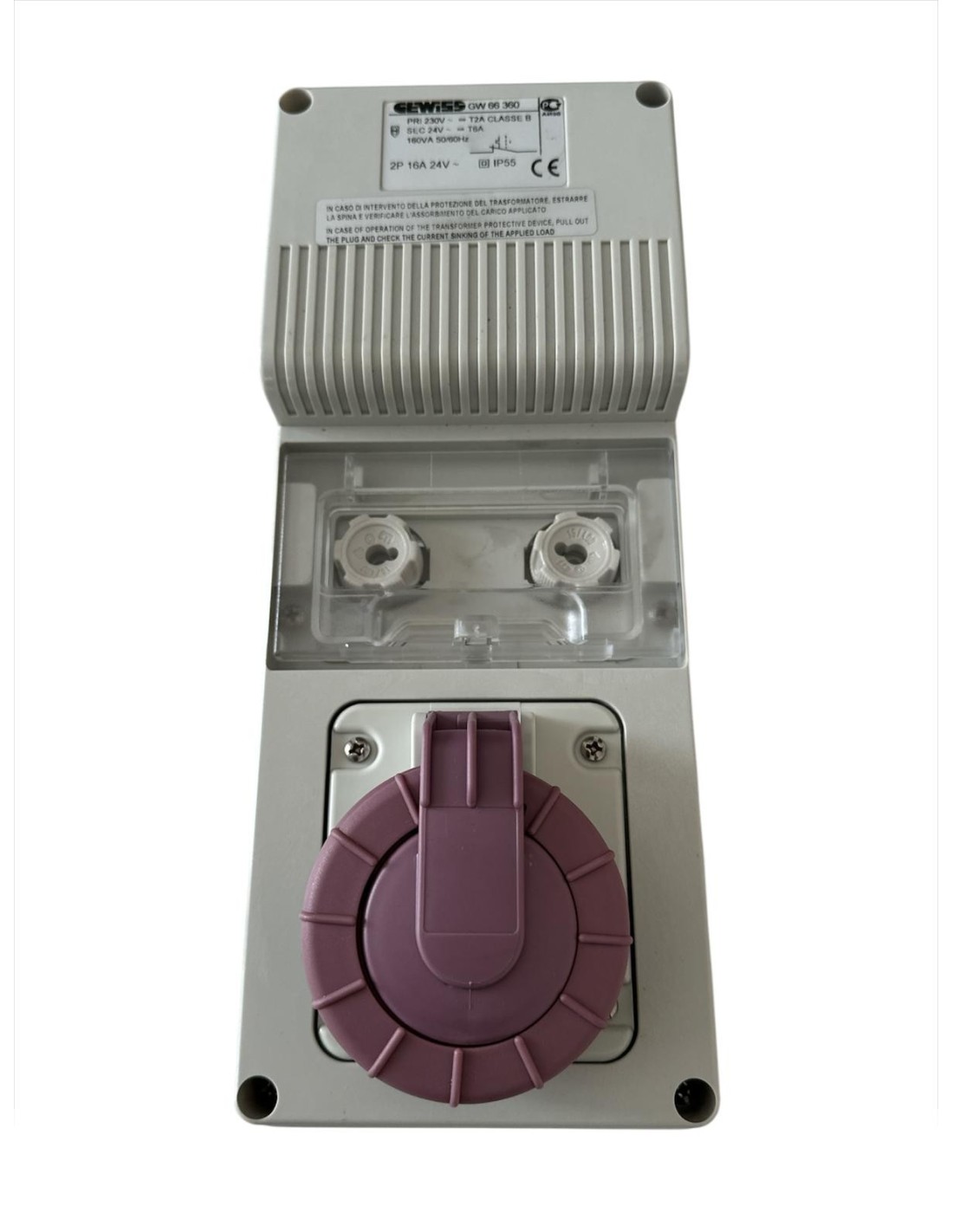 Prise Gewiss GW66360 verticale à verrouillage sans fusibles, 2 pôles, 160 VA, transformateur 230 V/24 V, IP55, boîtier inférieur