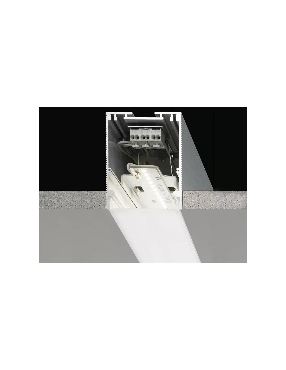 Profil modulaire pour installation encastrée au plafond ou au mur en intérieur, avec émission directe. Structure cachée pour installation sur plaques de plâtre, en aluminium extrudé avec revêtement en poudre blanc RAL 9003. Ressorts pour la fixation du réflecteur en acier inoxydable. Livré complet avec modules lumineux et alimentation Fourni complet avec écran jetable pour lisser, enduitr et peindre la surface d'installation Écran diffuseur en polycarbonate extrudé avec finition opaline ou microprismatique à commander séparément Fixation, jointage et fermeture à commander séparément Dimension du trou d'encastrement : 896x75mm (35,3x3)