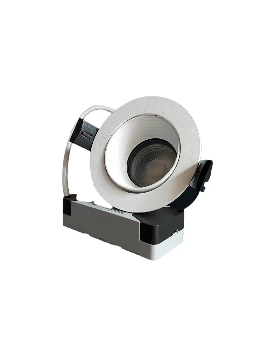 Informations techniques Source lumineuse : LED, 3000K, CRI 90 Efficacité du luminaire : 72lm//W Luminaire : 9 W, 650 lm Durée de vie de la LED : 50000h - L80 - B20 (Ta 25°C) Haute cohérence des couleurs 3 SDCM Alimentation électrique : 220- 240V 50//60Hz Câblage : ON OFF Optique : Flood 36° (réglable 30°) UGR : 19 Couleur : Blanc - 11 Poids : 0,3 Kg Trou encastré Ø 75 mm Dimension : A : Ø 82 mm B : 79 mm