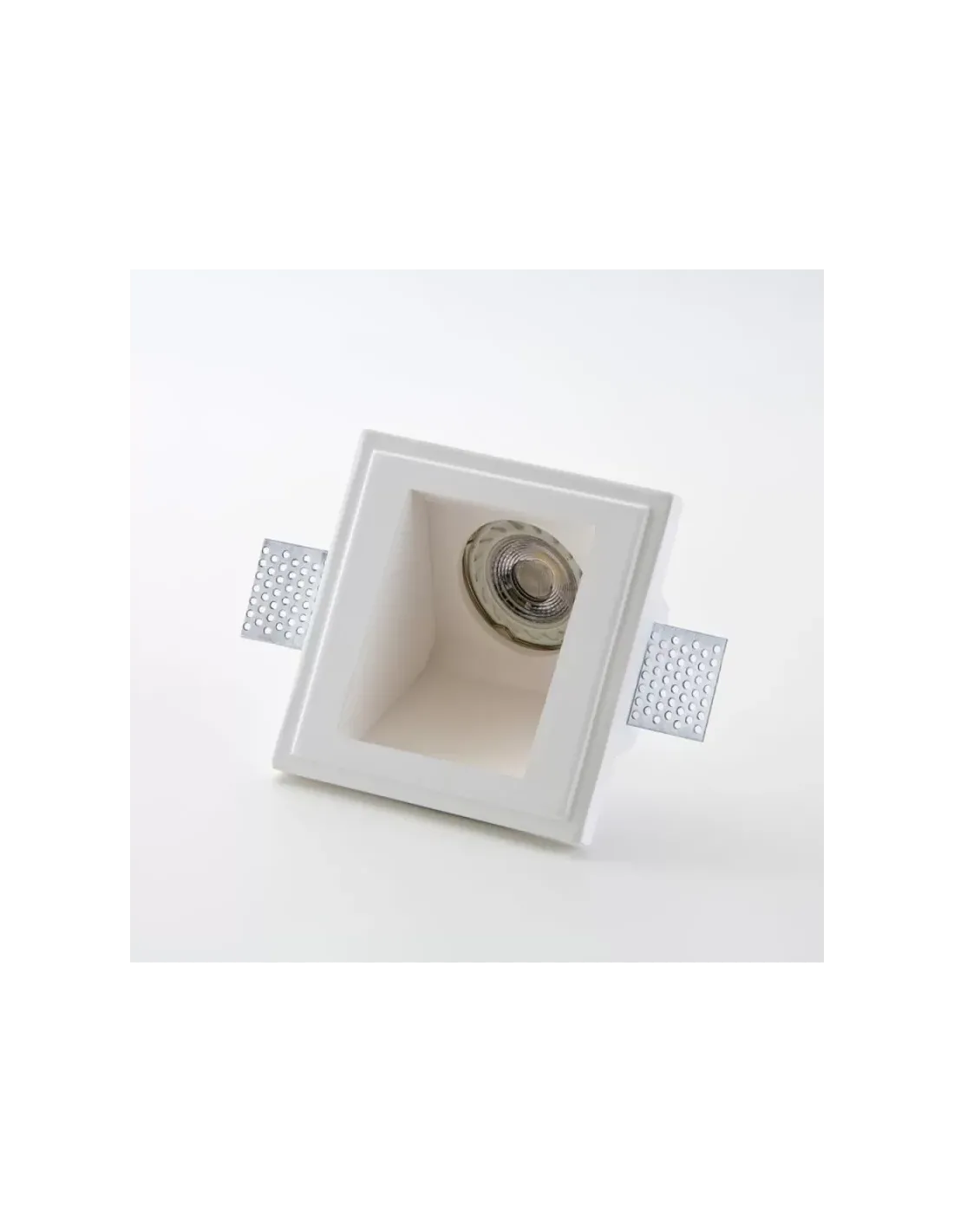 DESCRIPTION Spot carré encastrable en plâtre, montage encastré à encastrer avec supports en aluminium intégrés pour plaques de plâtre de 9 à 18 mm Finition à peindre en blanc Dimensions trou : 125x125 mm, profondeur minimale : 110 mm Raccord GU10 max 35W Appareil sans ampoule, orientation de la lumière 45° AVANTAGES Design élégant CONSEILS D'UTILISATION Classe de protection 2 : protection supplémentaire via câbles double isolation