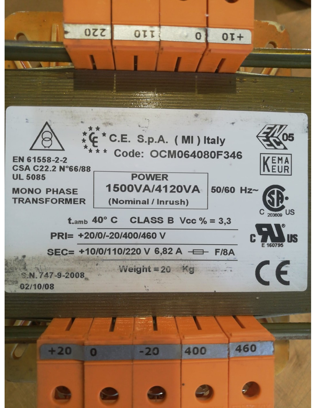 ocm064080f346 frasformatore monofase di isolamento 1500va primario 0-400-460v secondario 0-110-220v